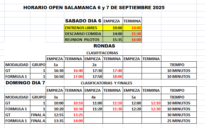 Primero quiero felicitar a todos los pilotos de esta modalidad que participarón en el Campeonato de Europa en Luxemburgo por sus buenos resultados en especial a Oriol Gil por ser el Campeón de Europa Junior “ FELICIDADES TEAM GIL ” . También recordar que ya estan abiertas las inscripciones para la próxima carrera en el mes de septiembre en Salamanca en el Club Charro que se va a celebrar el OPEN AECAR 2025 SALAMANCA GE los días  6 y 7 de septiembre , el precio de la inscripción será de 40€ en una , dos o tres  modalidades, Las inscripciones se cerrarán el domingo 31 de agosto a las 23:00 horas, el horario lo publicaremos el miércoles dia 3 de septiembre.