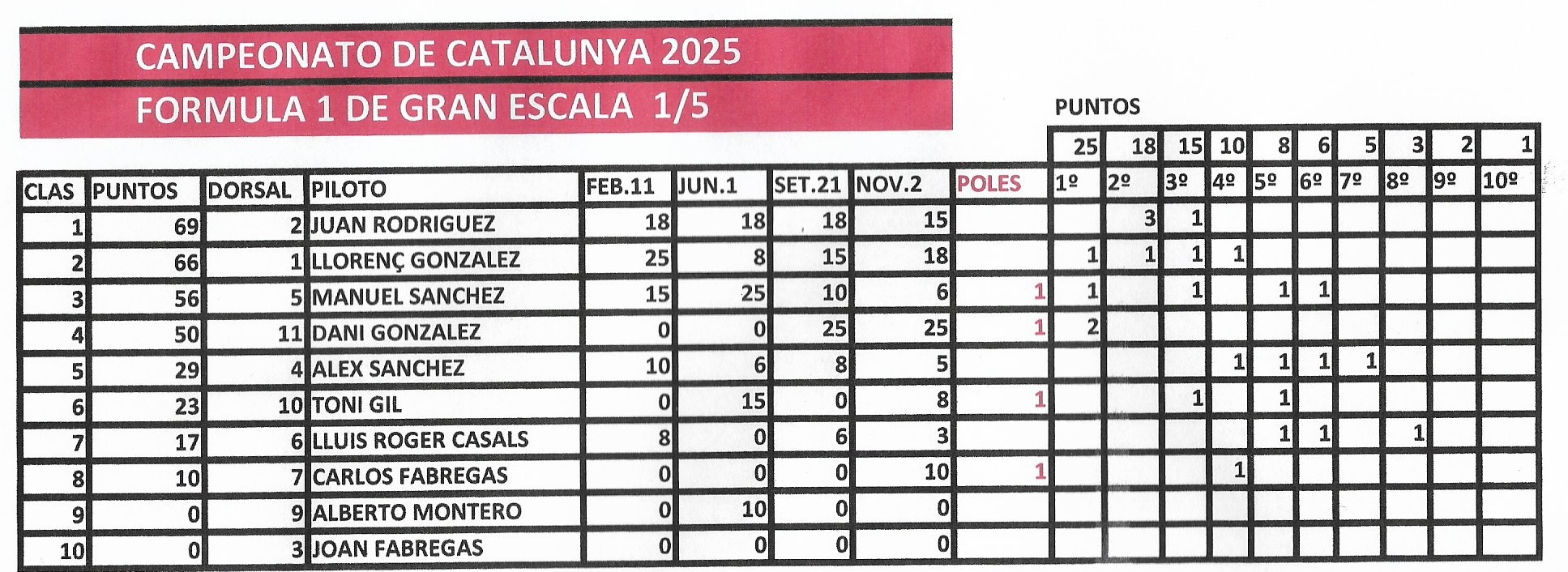 Hola a todos , quiero hacer un pequeño resumen de este Campeonato de Catalunya 2025 , han participado en las cuatro pruebas puntuables 23 pilotos de GT y 9 pilotos de Formula 1, Con muy buen ambiente de hermandad ,colaborando y ayudando entre los pilotos , en las carreras la deportividad a sido excelente , Muchas Gracias a todos los pilotos partcipantes. También quiero felicitar a los Campeones 2025 de cada modalidad que son en GT ALEIX PIQUE que es el segundo año consecutivo que logra subir a lo más alto del podium y en F1 a Juan Rodríguez que se lo merece tras tantos años intentando subirse a lo más alto del podium y siempre se quedo en las puertas de este tan preciado titulo de Campeón. repito FELICIDADES a los dos.. Al finalizar las finales de GT y F1 se hizo la entrega de trofeos para todos los participantes a este Campeonato de Catalunya 2025 , Acto seguido se realizo el sorteo de material y vales de compra de productos de radio control cedidos por los siguientes colaboradores : MECATECH ESPAÑA RS 5 ESPAÑA DCARMEN RC - TARRASSA También quiero dar las gracias a los tres clubs ( Club Radio Control Rubí , Circuito R.C Cerdanyola y al Club Automodelismo R.C de Lleida ) por su apoyo para celebrar en sus instalaciones las carreras , también quiero dar las gracias a los directores de carrera que han hecho el esfuerzo de arbitrar en sus días libres que no tienen carrera en su modalidad para estar en esta modalidad de la Gran escala , Alfonso Pineda y Joan Rosell muchas gracias. Y como no podia faltar a Raúl Espinola por el trabajo de realizar todos los trofeos de este Campeonato gracias Raúl. Las clasificaciones finales del campeonato las podeis ver y descargar en el apartado de Clasificaciones de la web de AECAR. Espero que el año 2026 sea al menos igual o que seamos más los pilotos que se animen a participar en el Campeonato de Catalunya. Recibir un cordial saludo. | |||||||||||||||||||||||||||||||||||||||||||||||||||||||||||||||||||||||||||||||||||||||||||||||||||||||||||||||||