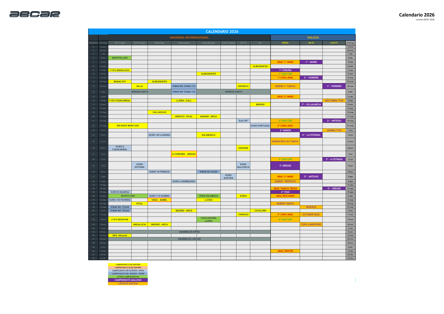 2ª prueba: Fene 10 de Mayo 3ª prueba: Boiro 28 de Junio 4ª prueba: Villagarcia 19 de Julio 5ª prueba: Carballo 9 de Agosto 6ª prueba: Porriño 20 de Septiembre Para el resto de reglamentación técnica y organizativa se aplicará el reglamento AECAR vigente recalcando en la buena conducta de todos los pilotos en pista y en el pódium pudiendo aplicar la normativa y sanciones vigentes sobre este tema. Si mas desearos un buen año que disfrutemos de nuestro hobby Delegado regional Andrés Luces. | ||||||||||||||||||||||||||||||||||||||||||||||||||||||||||||||||||||||||||||||||||||||||||||||||||||||||||||||||||||||||||||||||||||||||||||||||||||||||||||||||||||||||||||||||||||||||||||||||||||||||||||||||||||||||||||||||||||||||||||||||||||||||||||||||