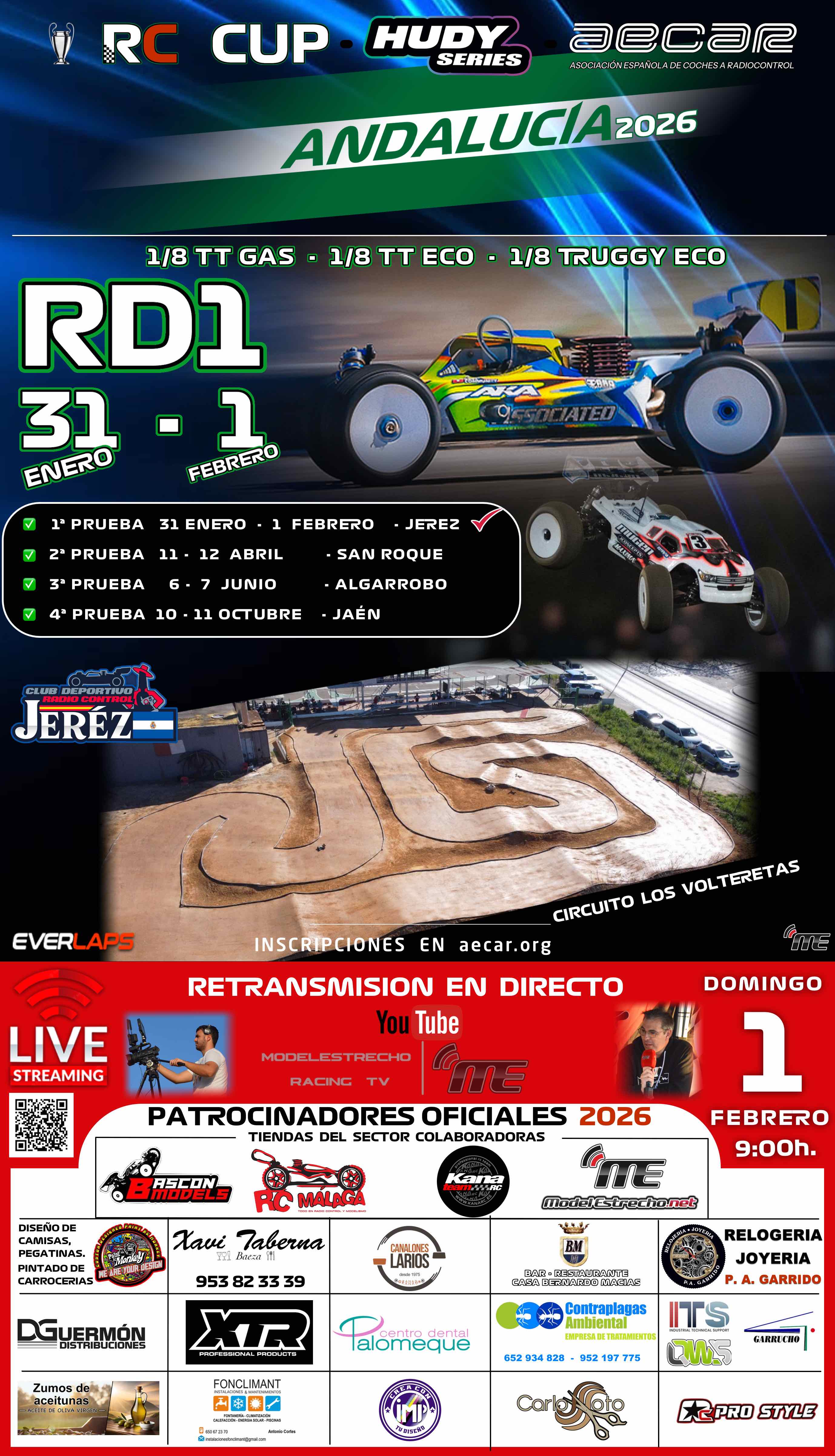✅ El CLUB RC LOS VOLTERETAS tiene el placer de invitaros a la 1ª Prueba RD1 de la 🏆 RC CUP - HUDY SERIES - AECAR ANDALUCÍA 2026 los días 31 de Enero y 1 de Febrero.