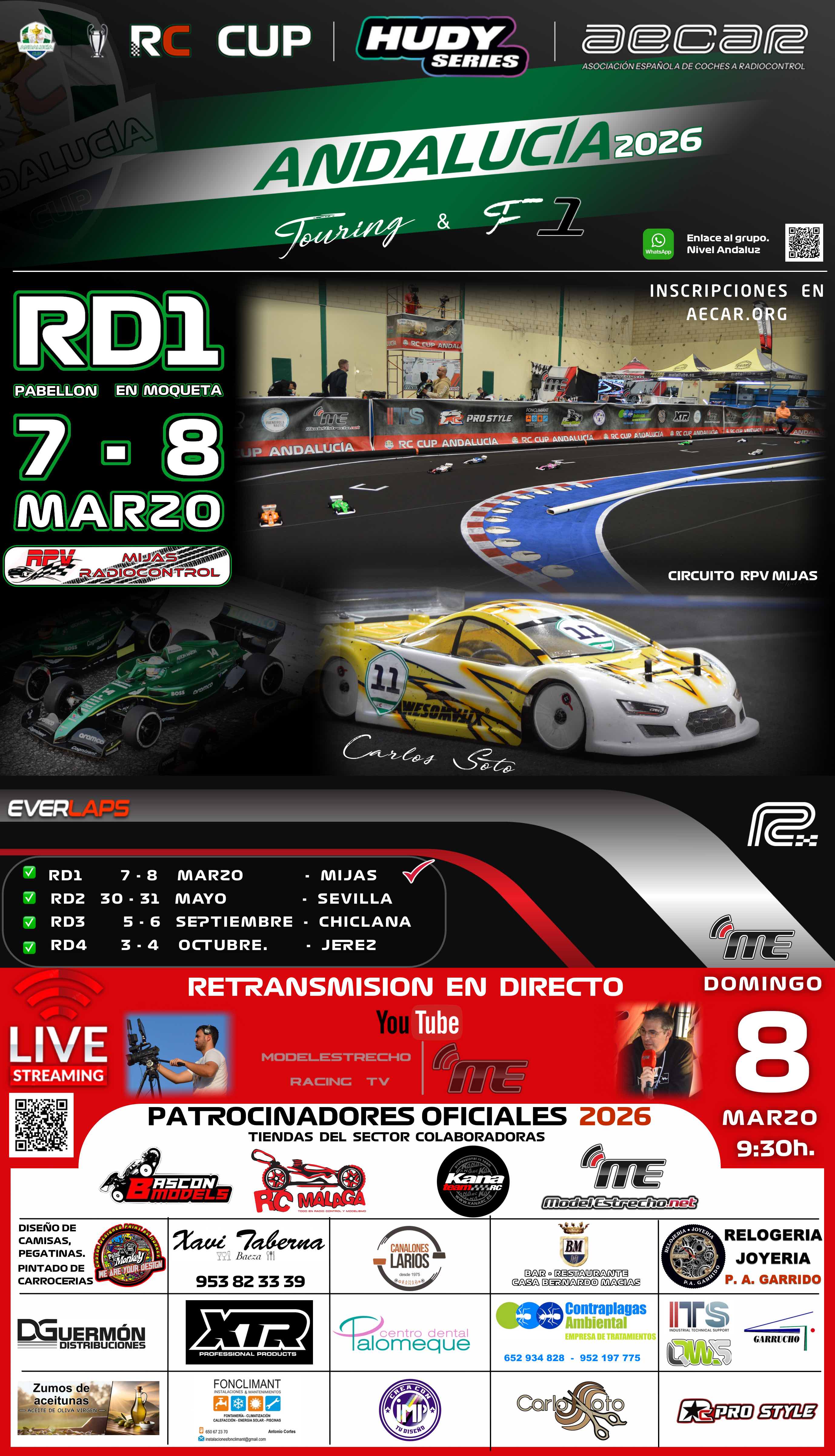 ✅ El CLUB RPV MIJAS tiene el placer de invitaros a la 1ª Prueba RD1 de la 🏆 RC CUP - HUDY SERIES - AECAR ANDALUCÍA TOURING & F1 2026 los días 7 y 8 de Marzo.
