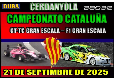 Hola a todos, el próximo día 21 de Septiembre se celebrará la 3ª prueba puntuable del Campeonato de Cataluña en las modalidades de GT y F1 de Gran Escala en el circuito de la localidad de Cerdanyola del Valles ( Barcelona) Circuito R.C MODELCAR DUBÀ . La inscripción de esta carrera se ara en la web de AECAR y su precio es de 25€ en una modalidad y de 35€ en dos modalidades , las inscripciones se cerrarán el día 18 de Septiembre a las 21:00 horas y el horario previsto se publicará el viernes día 19 en el grupo de WhatsApp Cataluña ,el Sábado día 20 de Septiembre el circuito estará abierto desde las 10:00h para entrenos libres , Para participar en esta carrera será obligatorio cualquier licencia AECAR Senior o la de Club , si algún piloto necesita mecánico será también obligatorio poseer la licencia de mecánico. Desde el 1 de septiembre para el que no tenga licencia Senior y quiera participar en este evento el precio de la licencia será de 30€ valida hasta el 31 de diciembre 2025 ..Para cualquier duda mi teléfono es 619840640.. El enlace directo a las inscripciones para GT https://www.aecar.org/sol_inscripcion.php?prueba=ins_ge_cat_56 El enlace directo a las inscripciones para F1 https://www.aecar.org/sol_inscripcion.php?prueba=ins_ge_cat_57 Saludos