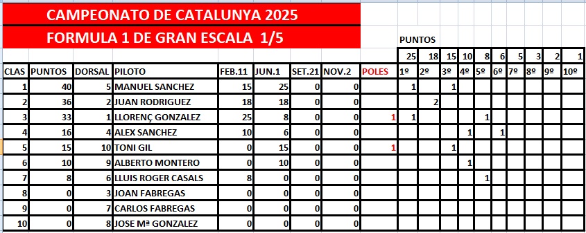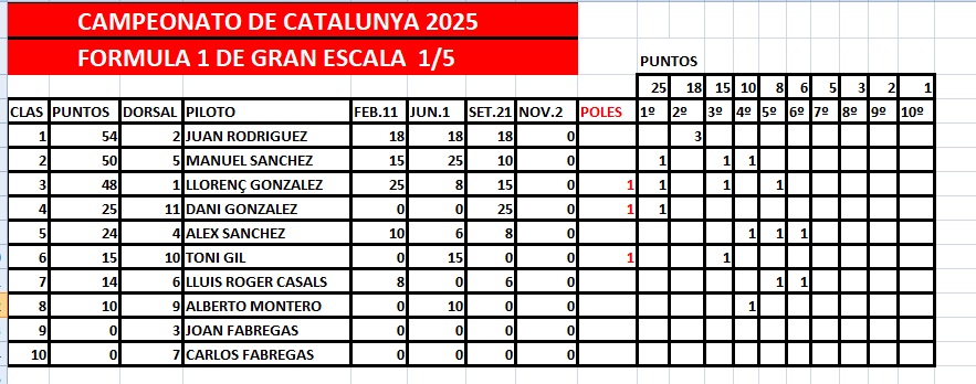 Hola a todos, la carrera de hoy en el circuito en Cerdanyola del Valles (Barcelona), al final hemos sido 13 pilotos VALIENTES a pesar de la lluvia , nos decidimos a celebrar la carrera entre lluvia , sol etc. Desde estas líneas dar las GRACIAS a todos los que se han desplazado al circuito , como siempre con muy buen ambiente en Paddock , también agradecer al Club RC Modelcar DUBÀ con el Sr. Joaquim a la cabeza del club y ayudando como arbitro al director de carrera , como no al muy querido por todos los pilotos Sr. Alfonso Pineda y a Toni Zoroa por su gran labor en el cronometraje . La siguiente i última carrera de este Campeonato se celebrara el dia 2 de noviembre de 2025 en el circuito de Rubi ( Barcelona ) con la entrega de trofeos para todos los participantes y el sorteo de material cedido como siempre por los colaboradores a este Campeonato . Tanto en Turismos como en Formula 1 las posiciones finales se decidirán en Rubi , ya que algun fallo mecánico en la última carrera puede variar la clasificación final ya que en el reglamento actual no se descuenta ninguna carrera puntúan todas las carreras finalizadas… las clasificaciones provisionales estan actualizadas en el apartado de RESULTADOS . Saludos | |||||||||||||||||||||||||||||||||||||||||||||||||||||||||||||||||||||||||||||||||||||||||||||||||||||||||||||||||