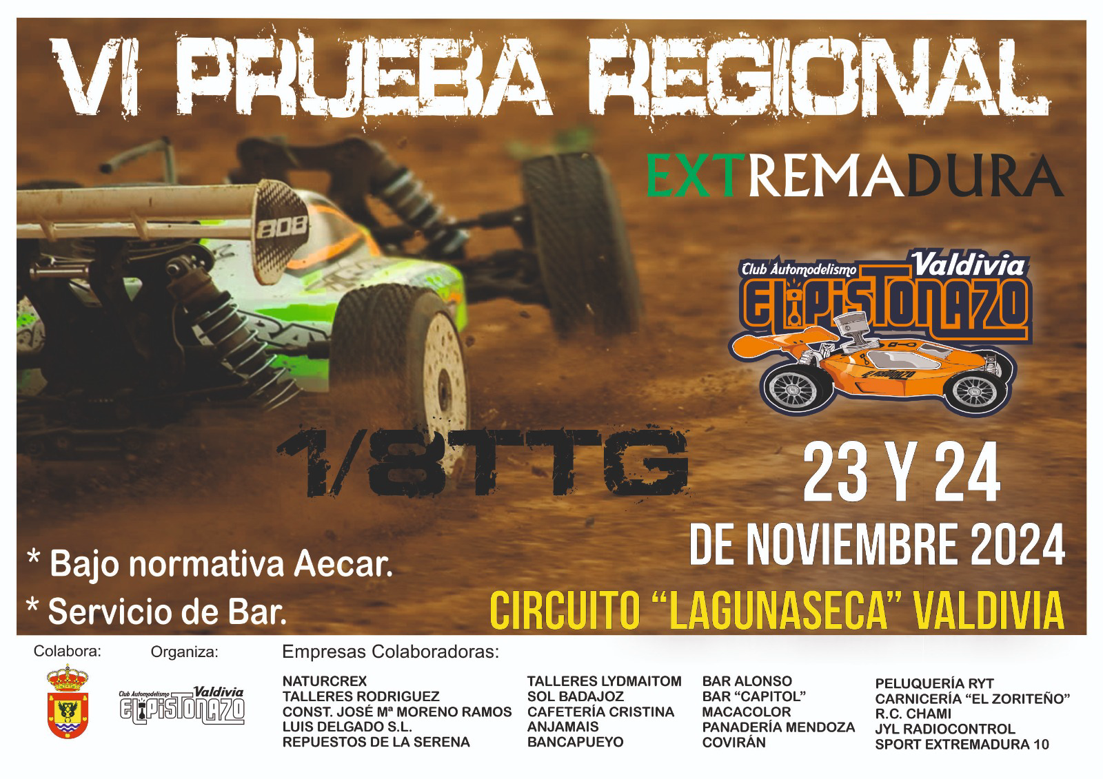 El club Rc El Pistonazo tiene el placer de invitarles a la 3ª prueba del regional de Extremadura 1/8TT GAS 2024, que se disputará los días 23 y 24 de Noviembre de 2024, en la localidad del Valdivia.